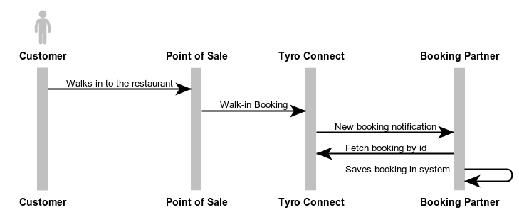 In scenarios where a customer walks in to the restaurant without a booking, the POS will need to inform the Booking partner about the booking. The sequence is as follows: